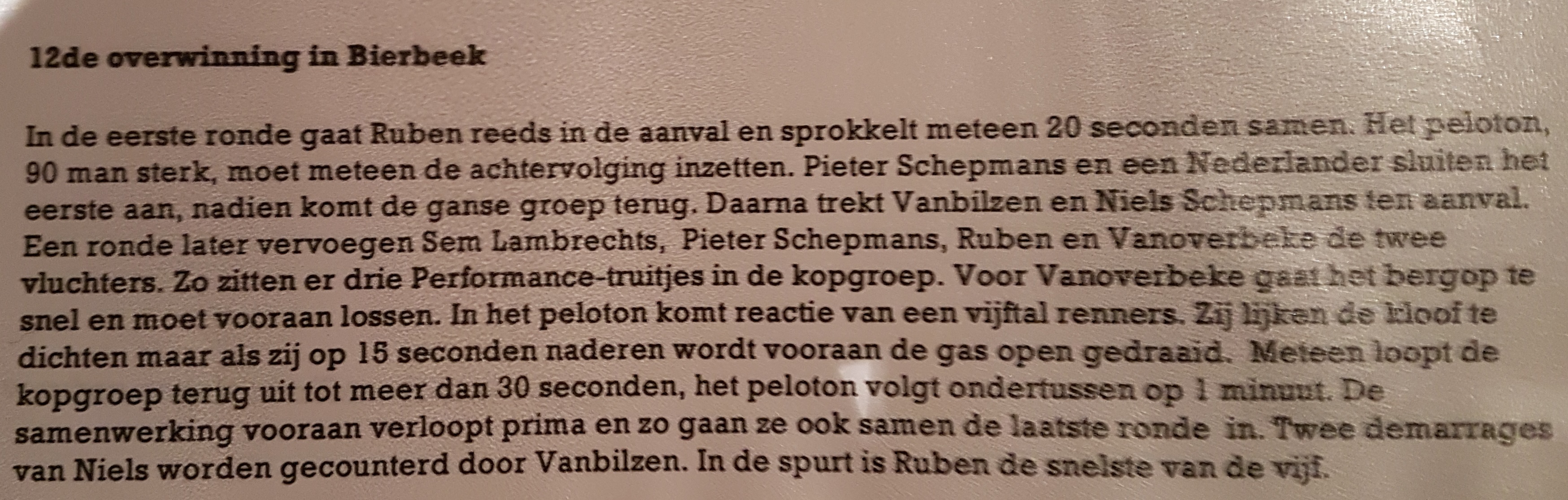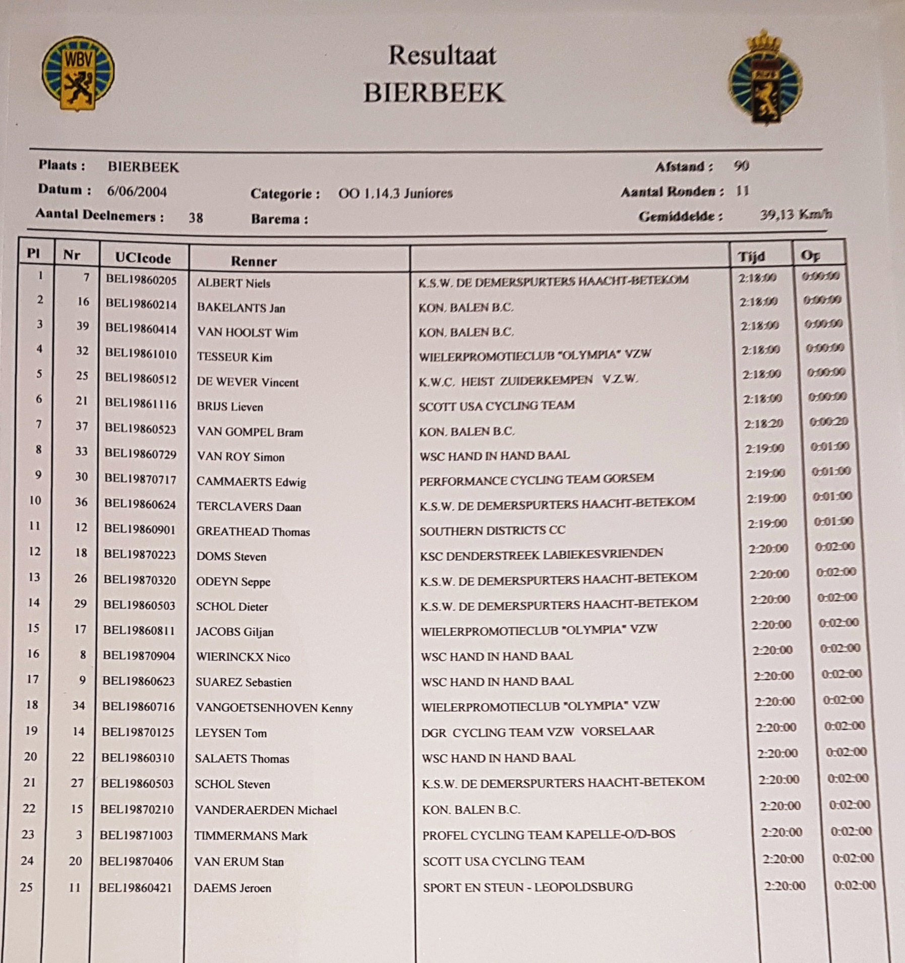 | 2004 | 8/aug | Bremt | nieuwelingen | 72 | Sébastien Piette | Birger Leys | Matthias Van Mechelen |