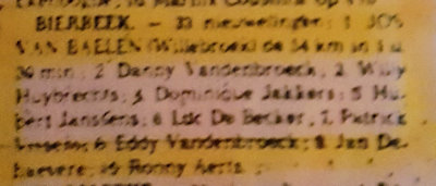 | 1977 | 15/aug | Bremt | nieuwelingen | 36 | Walter Lievens | Patrick Cranincx | Guido Verschueren |